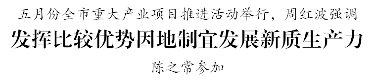 5月22日,市委市政府在六合区举行五月份全市重大产业项目推进活动。市委书记周红波强调,要牢牢把握高质量发展首要任务,完整准确全面贯彻新发展理念,聚焦聚力抓龙头企业、抓产业生态、抓营商环境,充分发挥比较优势,因地制宜发展新质生产力。市长陈之常参加。活动现场考察了六合区的3个先进制造业及相关产业项目。