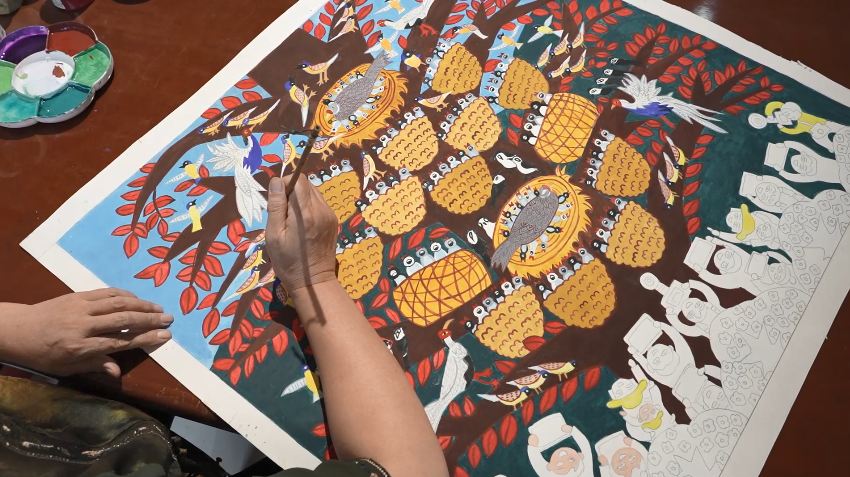 在冶山街道的六合农民画美术馆,只见农民画画家王金凤正在案前凝神执笔,复刻此次获奖作品《观鸟 爱鸟 护鸟》。画面以一棵大树为视觉中心,树上鸟巢错落,成鸟与幼鸟相依相偎,画面下方爱鸟人举起相机记录自然美好,每一处都延续着她对生态保护的深情呼吁。