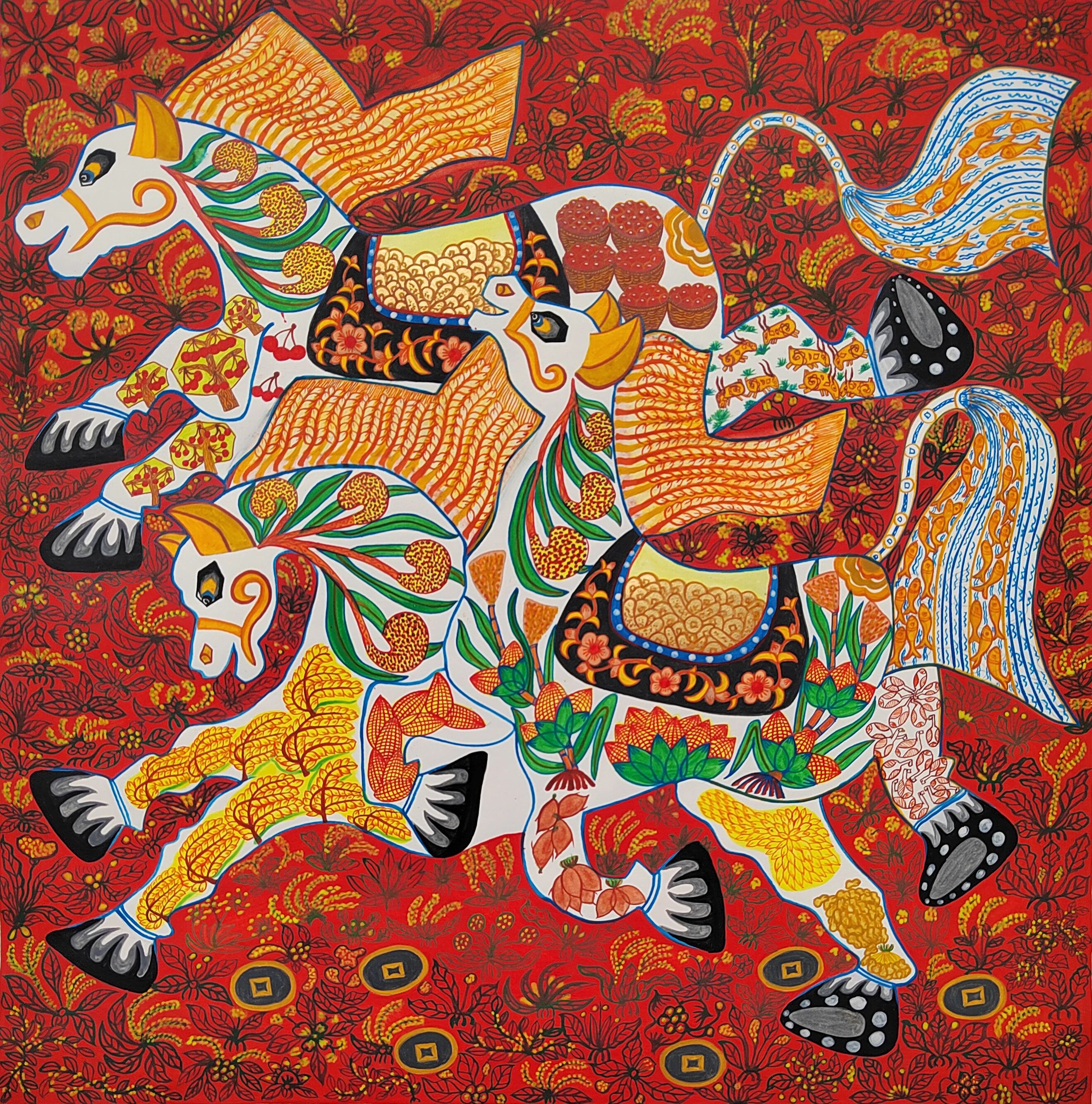 今年,“马”成为画作共同的主题。农民画家们用鲜活的色彩、朴拙的笔触,将新春的欢腾与希望尽情挥洒于纸上。