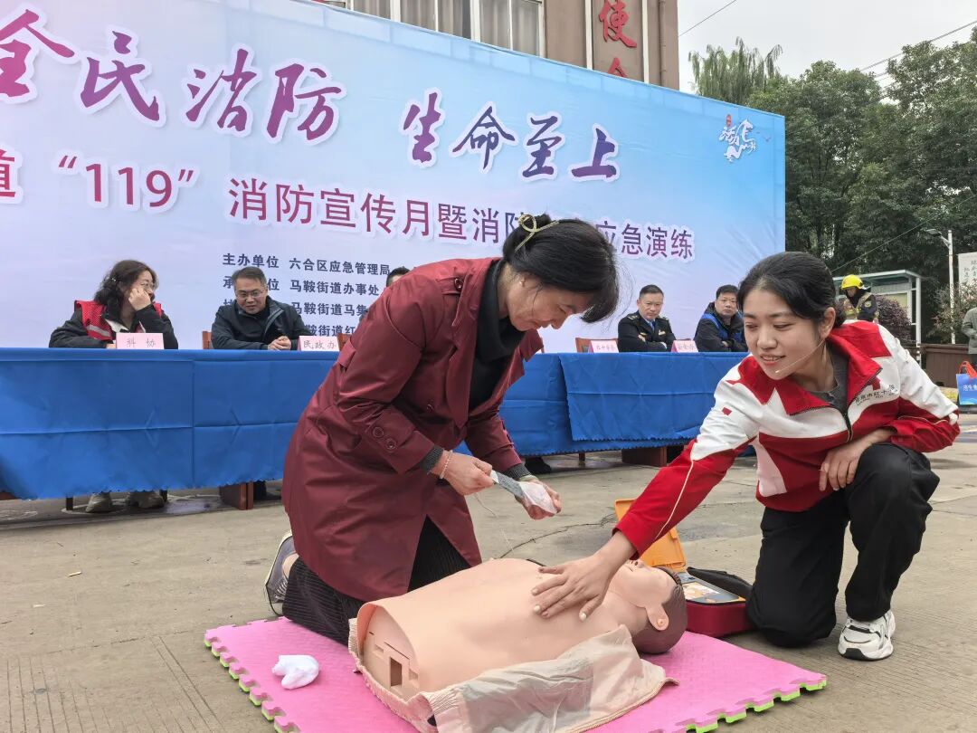 技能提升,应急救护与灭火实操双管齐下。应急救护演示中,六合区红十字会志愿者示范心肺复苏、AED等急救操作,讲解火灾常见伤害处理法,居民们认真观看,不少人主动实操。模拟灭火环节,消防宣传员结合案例讲消防常识,居民代表在指导下用灭火器扑灭模拟火源,掌握灭火技能。