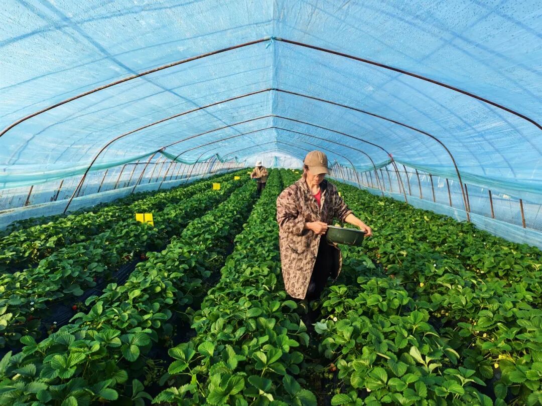 在草莓大棚内,几名工人正在熟练地采集草莓,不久之后,这批草莓就将被送往海南等地销售。“采摘时动作要轻,用手指轻捏草莓,从果柄处掐断,切勿过度拉扯,避免草莓与果枝受损严重,影响食用。”杨中亮说道。