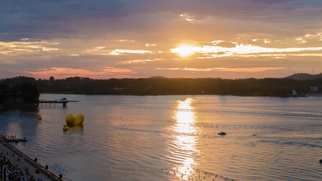 夜晚来临,住在金牛湖奥帆基地的亲子套房赏金牛湖的湖光山色。
