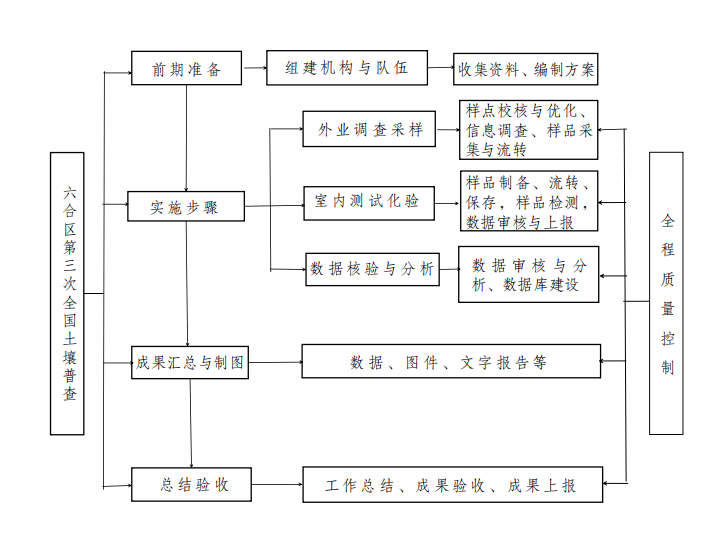 在国家组织开展的平台构建、底图制作、样点布设、实验室筛选、规范规程制定、人员培训等工作基础上,按照国家、省市有关要求,以及《第三次全国土壤普查技术规程(修订版)》《第三次全国土壤普查土壤类型名称校准技术规范(修订版)》《第三次全国土壤普查工作底图制作与采样点布设技术规范(修订版)》《第三次全国土壤普查外业调查与采样技术规范(修订版)》《第三次全国土壤普查土壤样品制备与检测技术规范(修订版)》《第三次全国土壤普查全程质量控制技术规范(修订版)》《第三次全国土壤普查数据库规范(修订版)》《第三次全国土壤普查土壤类型图编制技术规范(修订版)》《第三次全国土壤普查土壤属性图与专题图编制技术规范(修订版)》《第三次全国土壤普查土壤生物调查技术规范(修订版)》等规程规范,认真组织开展六合区第三次全国土壤普查工作。