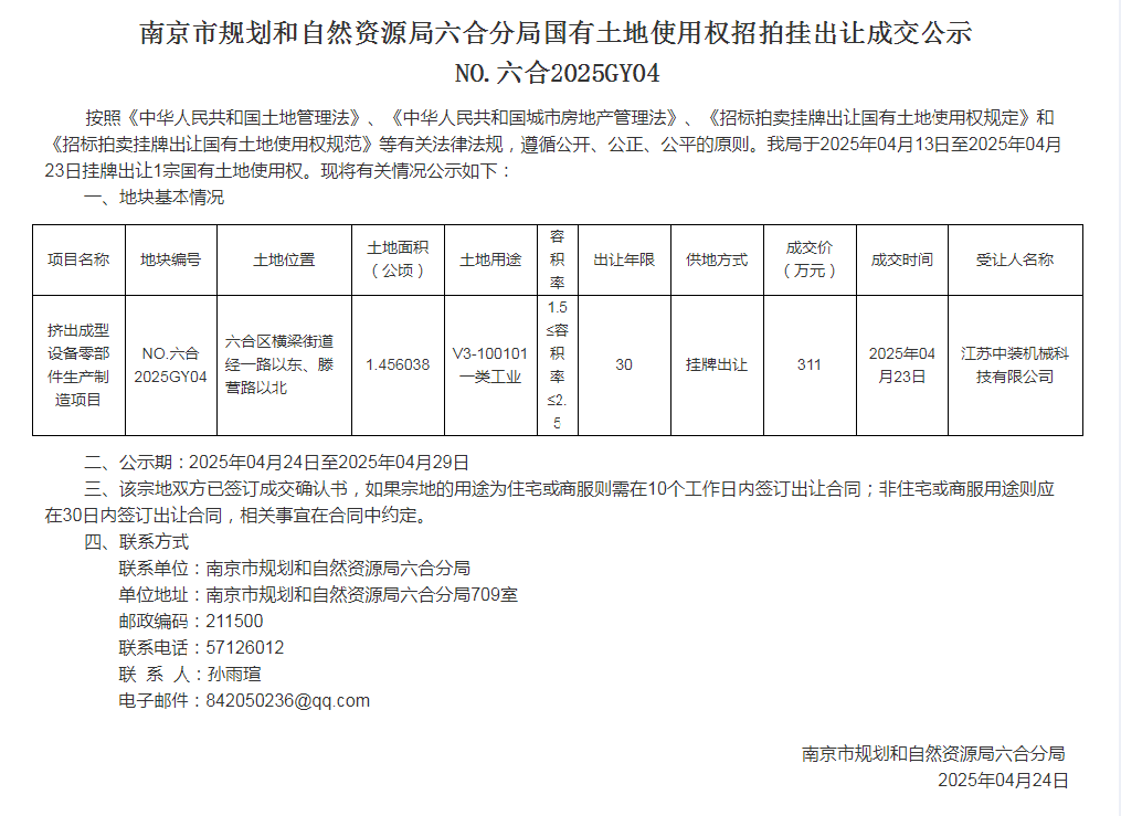 南京市规划和自然资源局六合分局国有土地使用权招拍挂出让成交公示