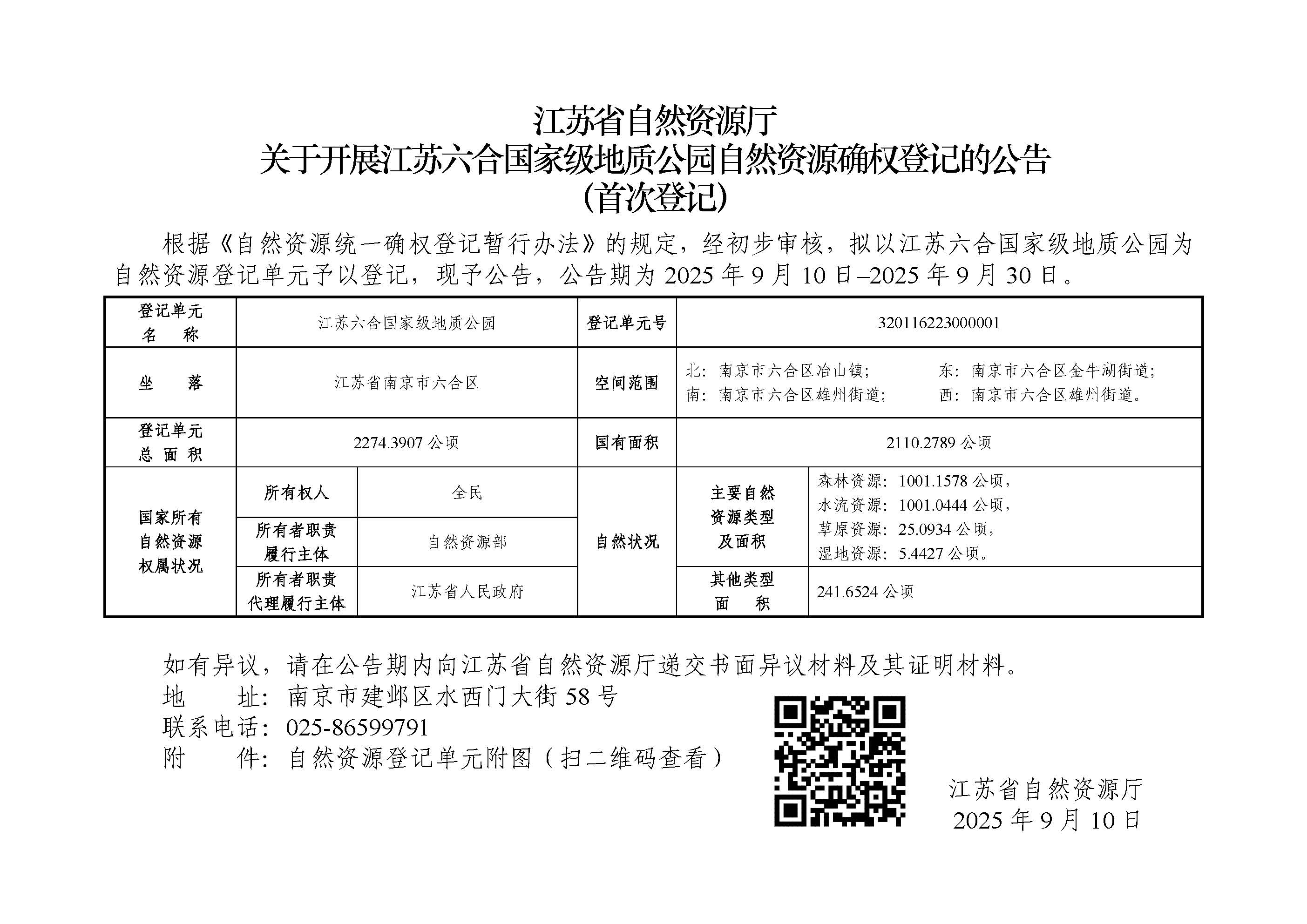 江苏省自然资源厅 关于开展江苏六合国家级地质公园自然资源确权登记的公告