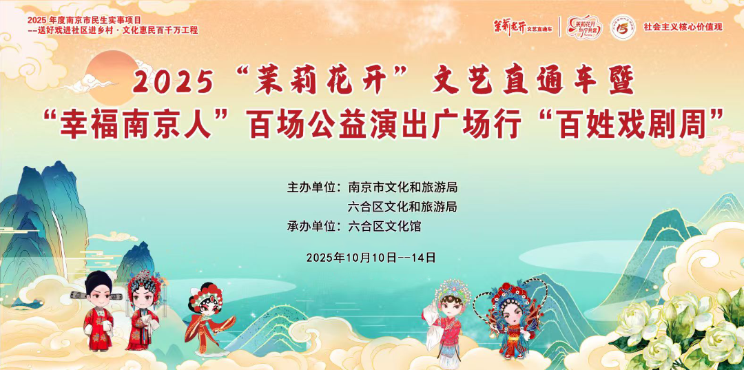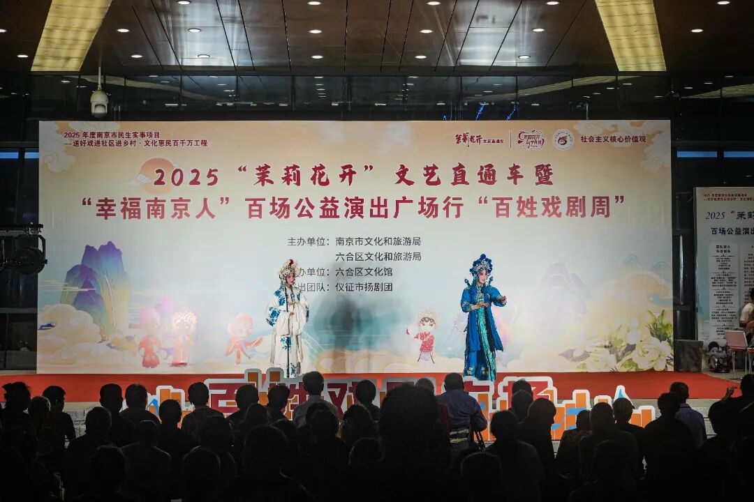 10月10日至14日,每天傍晚六点半到八点,“茉莉花开”文艺直通车暨“幸福南京人”百场公益演出广场行“百姓戏剧周”活动在六合区文化馆百姓戏剧广场精彩上演。“茉莉花开”文艺直通车作为江苏省“百千万”优秀群文活动品牌之一,本次特别邀请了五支优秀文艺团队——仪征市扬剧团、南京市小梅花青年越剧艺术团、南京群星戏曲艺术团、江西上高县文工团和南京四季艺术剧院,每天为市民奉上一场专场演出。