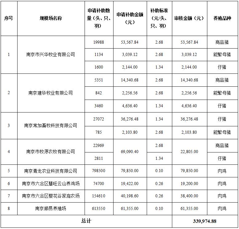 根据《南京市重大动物疫病强制免疫“先打后补”补助方案》(宁农计〔2024〕38号)等文件要求,核定南京市兴华牧业有限公司等8家养殖场(企业)符合“先打后补”财政补助资金申领条件,拟补助财政资金339974.88元(叁拾叁万玖仟玖佰柒拾肆元捌角捌分),现将补助情况公示如下: