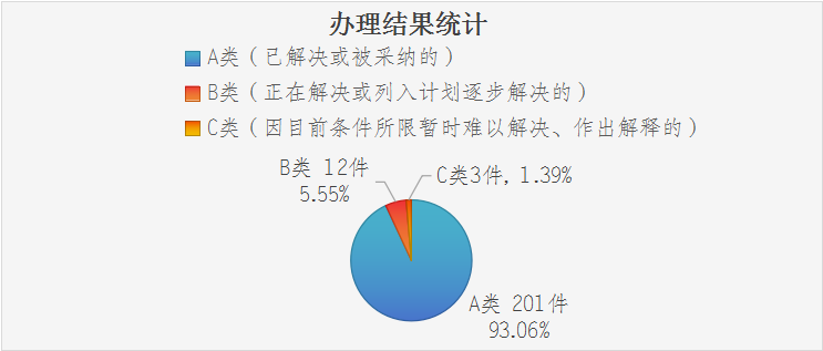 从办理结果看,A类提案201件,占比93.06%;B类提案12件,占比5.55%;C类提案3件,占比1.39%。