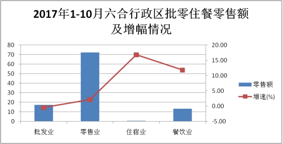 1-10月份,限上住宿餐饮业实现零售额13.38亿元,同比增长11.8%,其中住宿业2家企业,体量较小,同比增长16.8%,餐饮业完成零售额13.33亿元,同比增长11.8%。六合行政区住宿和餐饮业继续保持了较快的发展速度。