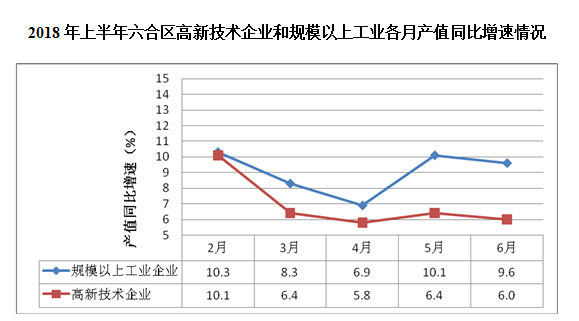 从生产情况来看,上半年,全区高新技术企业实现产值54.86亿元,同比增长6.0%,增速比规模以上工业平均水平低3.6个百分点,拉动规模以上工业产值增长2.7个百分点。从运行情况来看,各月产值增速虽平稳增长但均低于规上工业平均水平。从高新技术企业产值占规上工业比重来看,上半年占比为43.4%,高于一季度的43.0%、上个月的43.2%,呈逐月提高的趋势。