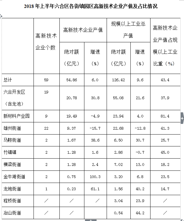 上半年,全区10个街镇园区中,除程桥、冶山街道无高新技术企业外,其余8个街镇园区中六合经济开发区(含龙池)、马鞍、金牛湖和龙袍四个地区的高新技术企业产值增速超过了30%,而其中属开发区的企业数和实现产值总量最大。