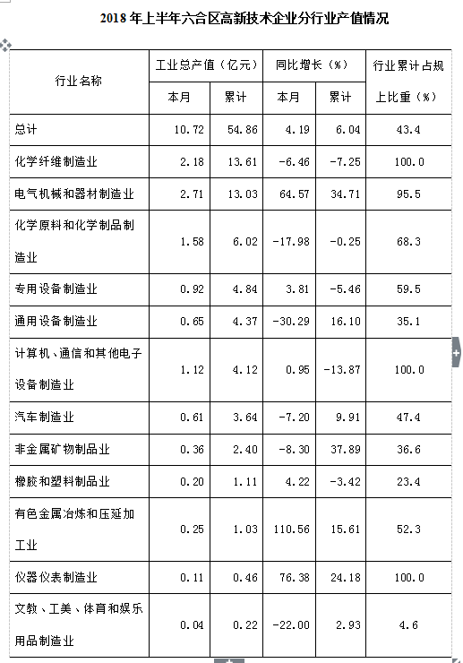 电气机械和器材制造业、通用设备制造业、汽车制造业、非金属矿物制品业、有色金属冶炼和压延加工业、仪器仪表制造业六个行业产值的同比增速均高于高新技术企业平均水平,是高新技术企业产值的增长点。化学纤维制造业、计算机通信和其他电子设备制造业则降幅较大,而产值占规上产值的比重却达到了100%,对全区高新技术产值和规上产值均影响较大。