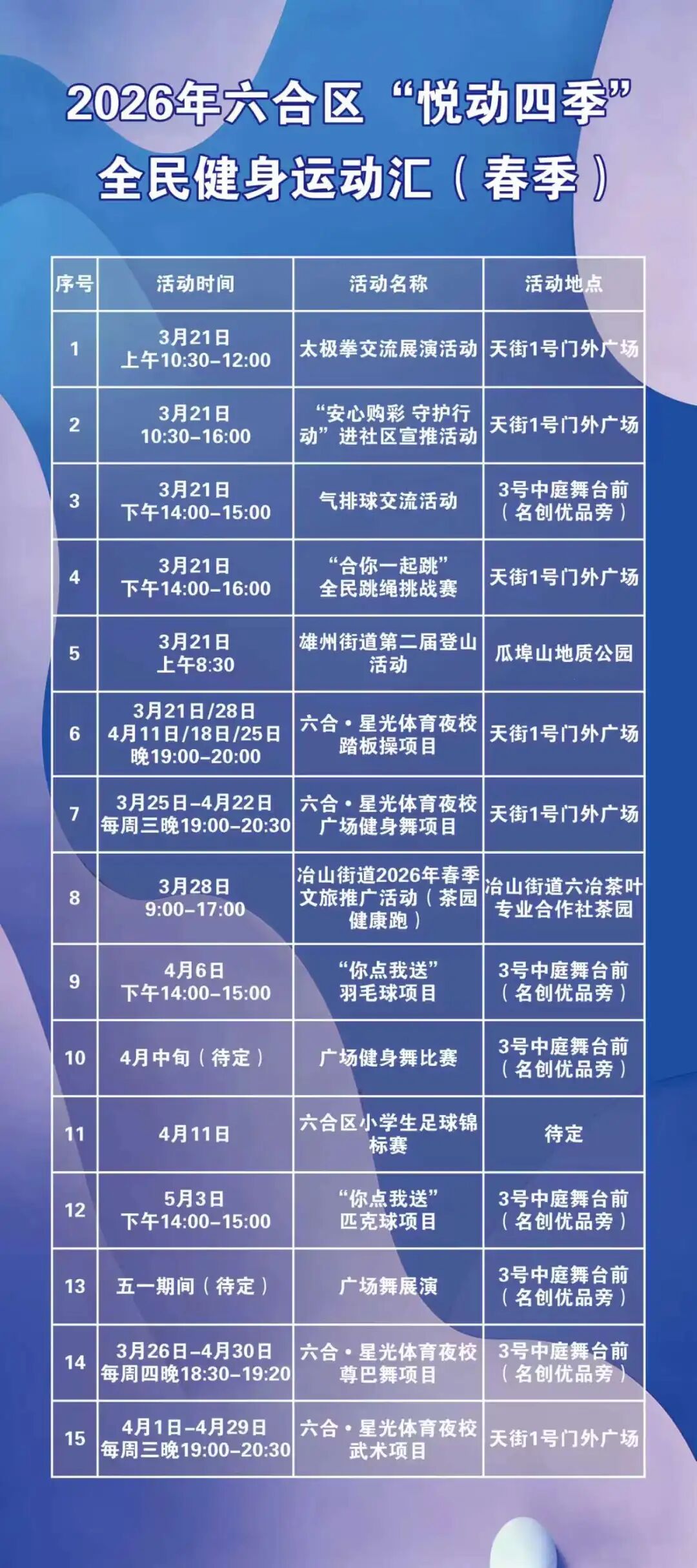 活动联动瓜埠山地质公园、冶山街道茶园等特色点位,实现自然风光、人文底蕴与商业活力的有机融合。3月21日首场推出雄州街道登山活动、太极拳展演交流、“合你一起跳”全民跳绳挑战赛、气排球交流等全民健身项目,结合“安心购彩 守护行动”反诈科普、航空运动科普宣传、星光体育夜校踏板操体验等特色内容,形成体育、科普融合的多元活动体系。此次春季全民健身运动汇共设置多项特色活动,涵盖星光体育夜校(踏板操、广场健身舞、尊巴舞、武术项目)、“你点我送”(羽毛球、匹克球项目)、茶园健康跑、小学生足球锦标赛等内容,活动时间覆盖每周固定时段及法定假期,辐射街道、景区,兼顾不同年龄段、不同运动需求的群众,真正实现全民健身全民参与。本次“悦动四季”春季系列活动将持续开展,具体活动安排详见下表。