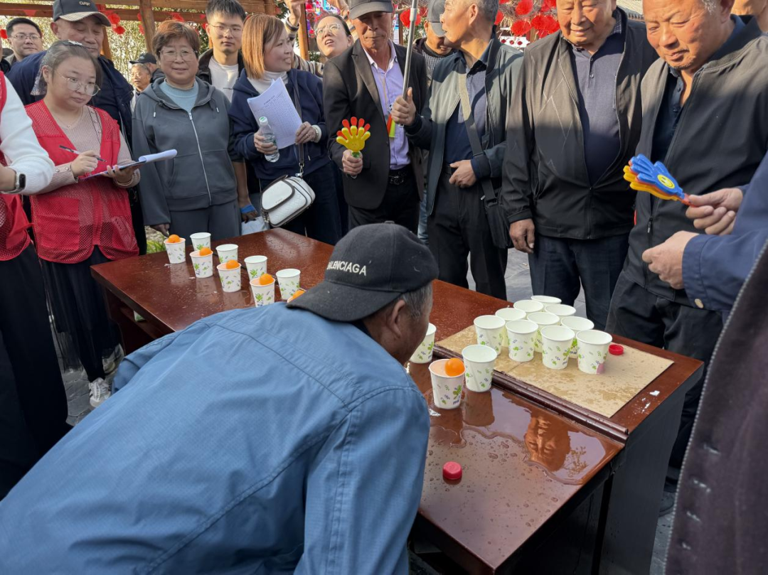 文艺演出后,“趣味运动+志愿服务”环节开启。老人们个个精神矍铄,热情高涨,踊跃参与。集体项目“花生接力赛”,各代表队选手蒙眼协作,趣味横生。随后,参与者可自由参加五项个人趣味运动,包括“球球水上漂”“弹球大作战”“扔飞镖”“套圈比赛”和“投壶比赛”。每项活动均配备两名志愿者负责规则讲解与裁判工作,确保比赛有序又安全。尽显老年人活力风采。