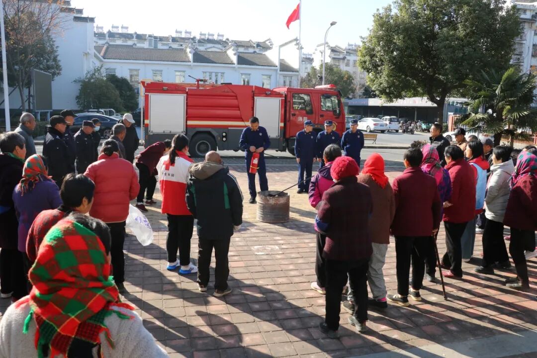 普法讲座结束后,消防安全演练紧接着展开。工作人员通过“现场讲解+实物演示”的形式,向村民普及火灾常见成因、初期火灾扑救方法、疏散逃生技巧等知识,重点演示了干粉灭火器“提、拔、握、压”的使用步骤和使用注意事项。在模拟火情实操环节,工作人员现场点燃模拟火点,村民们轮流上阵,按照规范流程操作灭火器灭火,大家相互学习、积极尝试,迅速掌握了灭火器的基本使用方法。