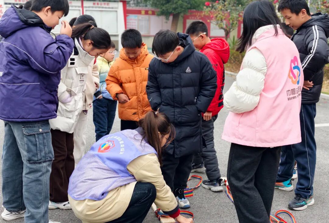活动伊始,社工带领孩子们了解传统节日趣味习俗,随后一系列团队游戏轮番上演。“闪电尾巴争夺战”点燃现场气氛,孩子们灵活穿梭、欢乐角逐;“同舟共济”环节中,两两一组穿特制板鞋同步前行,让孩子们体会协作真谛;“同心元宝”背靠背运气球游戏将活动推向高潮,终点处的暖心祝福卡片朗读,更添温馨暖意。