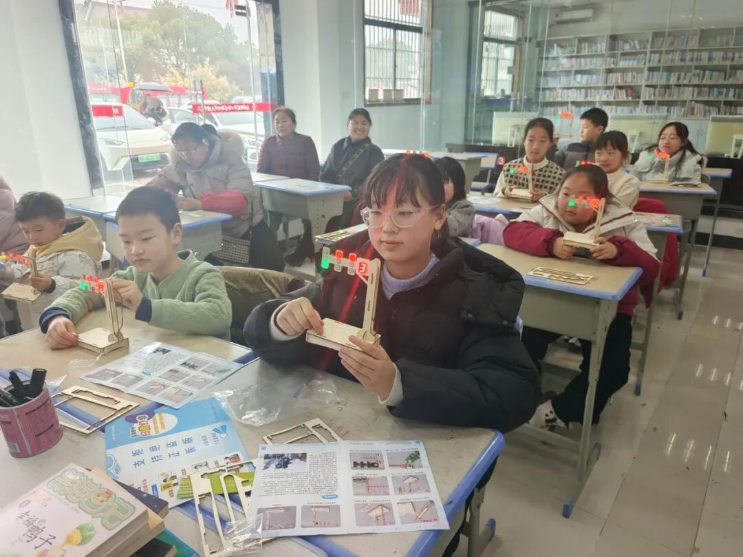 红绿灯手工制作环节中,孩子们在老师的指导下,动手识别电路板、LED灯、电阻、开关等元件,完成电路连接与模型组装,成功制作出红绿灯模型。随后,大家结合自己的作品模拟道路场景,进一步巩固科学知识与安全常识的综合运用。