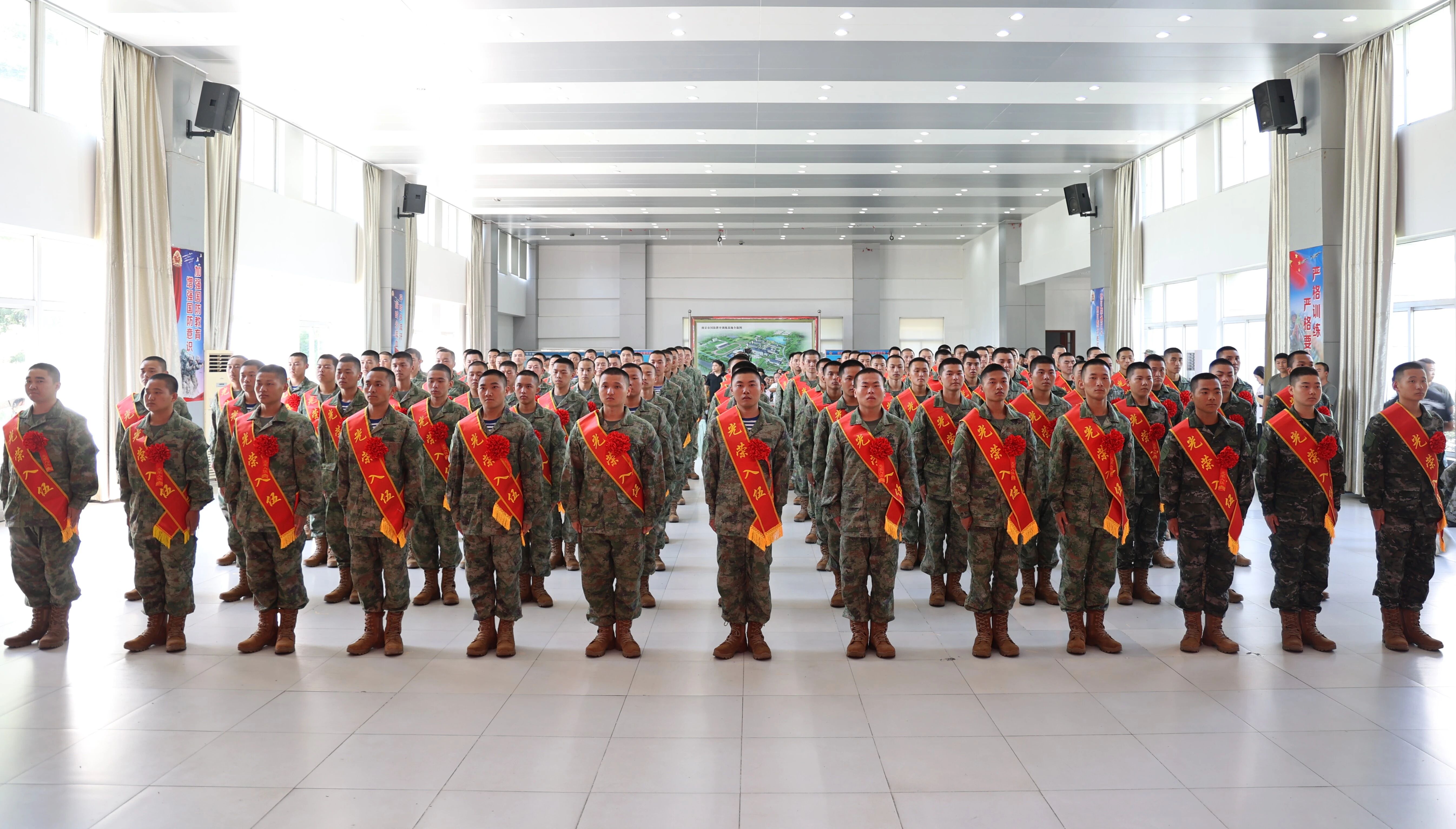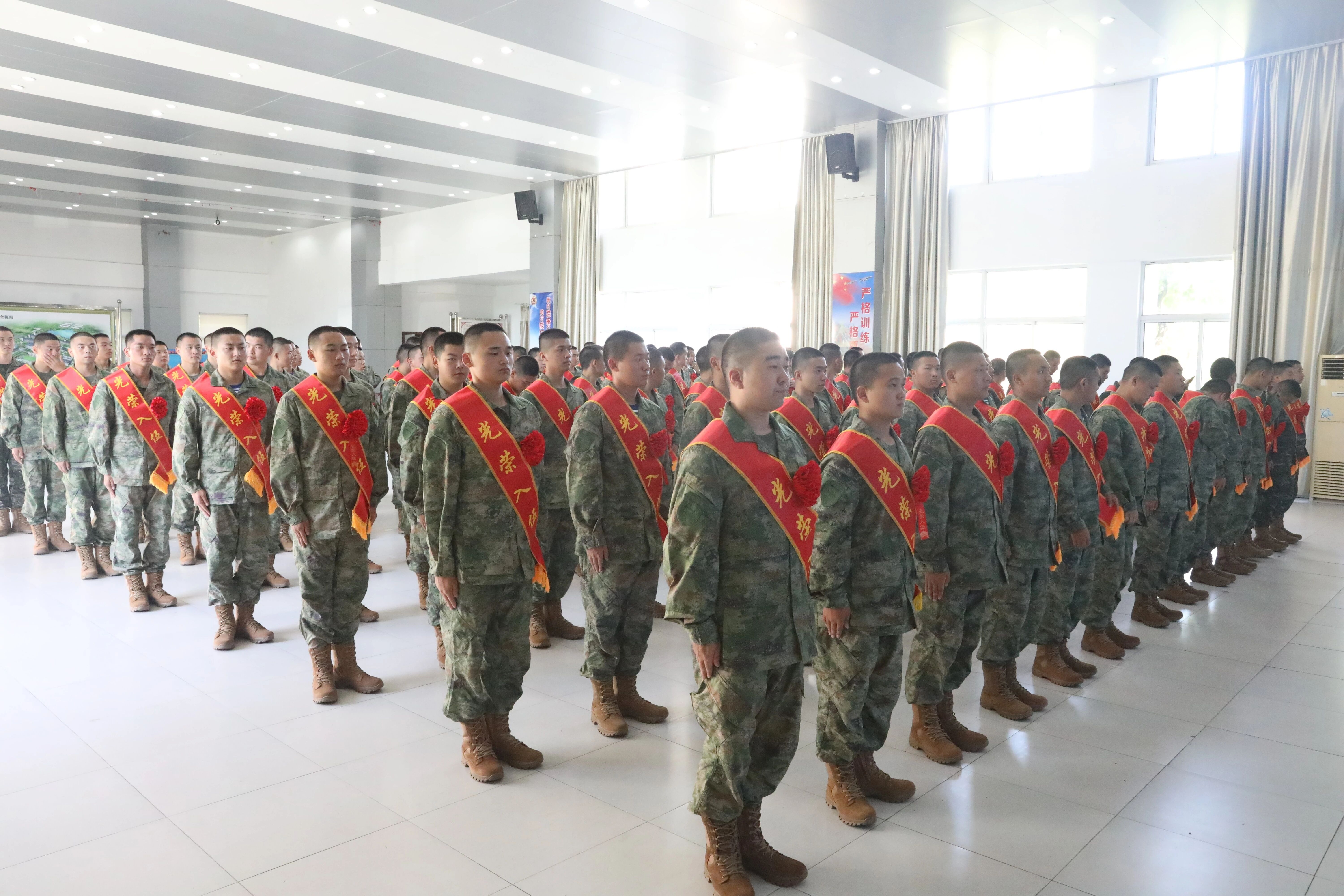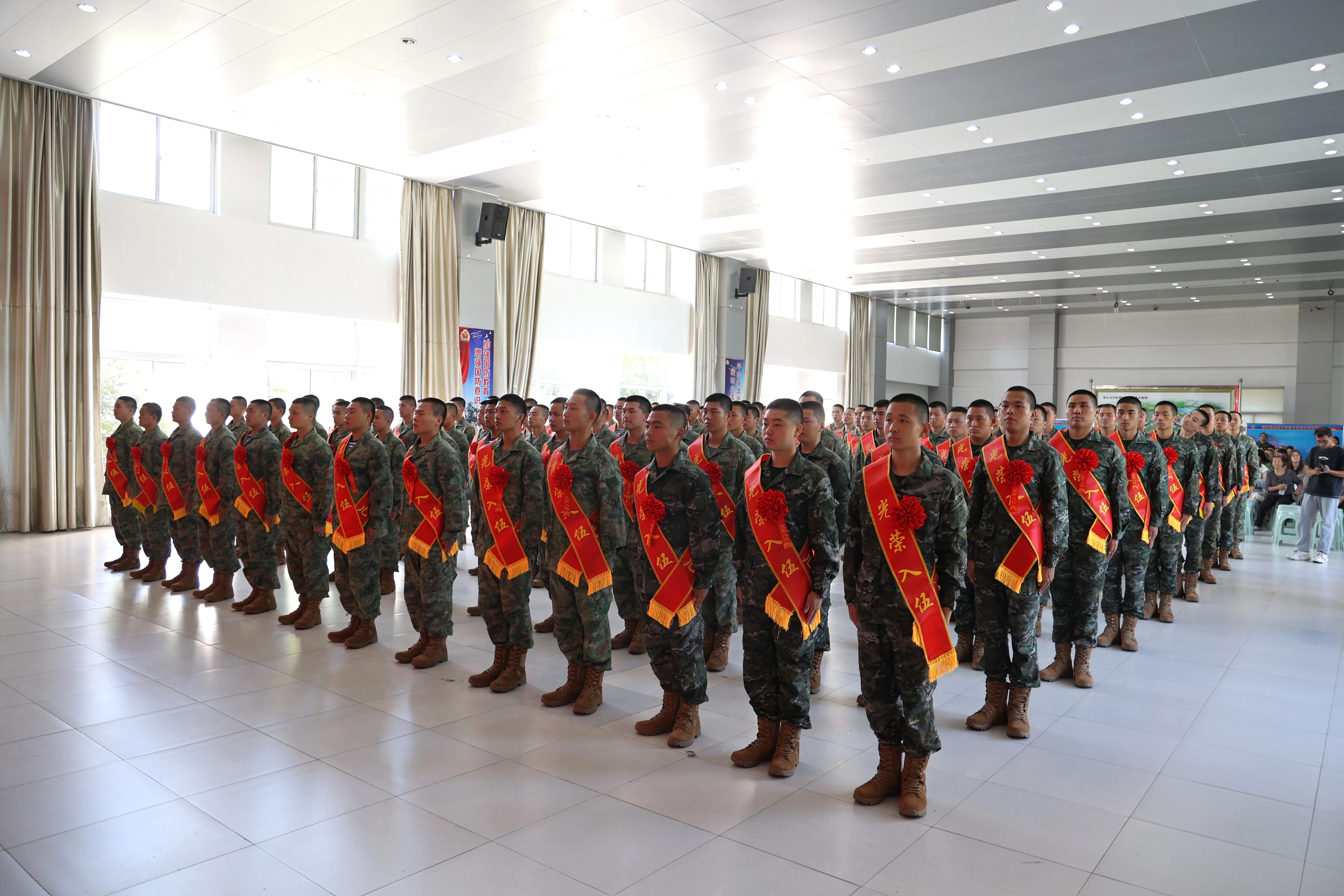 大会在雄壮的国歌声中拉开帷幕。身着戎装、胸佩红花、肩披绶带,100余名新兵整齐列队。他们精神抖擞、英姿勃发,坚毅的眼神中洋溢着对军旅生活的憧憬与期待,胸前的红花映照着青春的荣耀,承载着家乡的嘱托与祖国的期望。